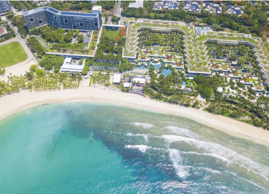 酒店坐北朝南,占地13萬平方米,由兩種風格完全不同的建筑構成。東側的水景閣是占地約5萬平方米,高3層的現代花園式環保建筑。每間客房均在80平米以上,包含16平方米的獨立觀景陽臺。遠眺椰林,近觀花園水景,讓您盡可能的融入大自然。水景閣還包含24棟海濱別墅,均配備私人泳池、花園。酒店西側的天閣樓高11層,60平米的客房面積內含一個10平方米的陽臺,讓您從絕佳的視角俯瞰小東海全景。