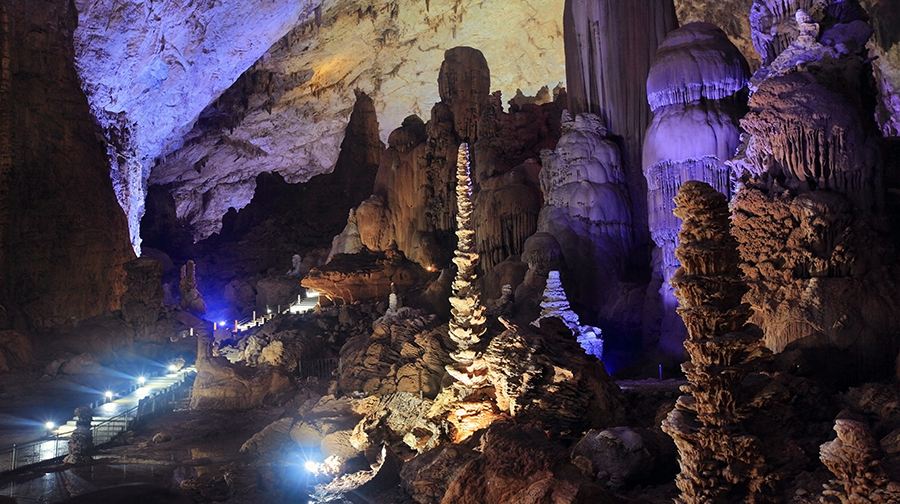 享有“天下第一洞”之稱的織金洞,位于貴州省織金縣官寨苗族鄉(xiāng),地處烏江源流之一的六沖河南岸,距省城貴陽(yáng)120公里。公園占地面積170 km2,海拔900~1670m。它是一個(gè)多層次、多類型的溶洞,洞長(zhǎng)6.6公里,最寬處175米,相對(duì)高差150多米,全洞容積達(dá)500萬立方米,空間寬闊,有上、中、下三層,洞中遍布石筍、石柱、珍珠田等四十多種堆積物,形成千姿百態(tài)的巖溶景觀。根據(jù)不同的景觀和特點(diǎn),分為迎賓廳、講經(jīng)堂、雪香宮、壽星宮、廣寒宮、靈霄殿等景區(qū),有47個(gè)廳堂、150多個(gè)景點(diǎn)。織金洞不僅有很高的旅游、美學(xué)價(jià)值,而且對(duì)于研究中國(guó)的古地理、古氣象學(xué)等都有極高的科學(xué)價(jià)值。