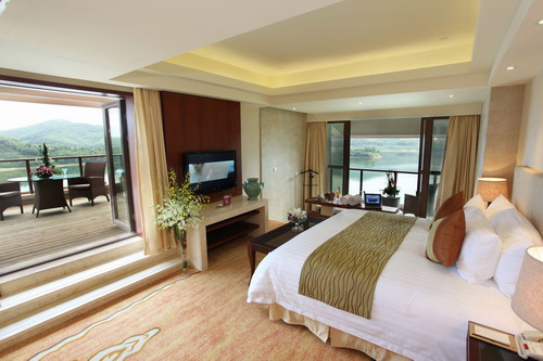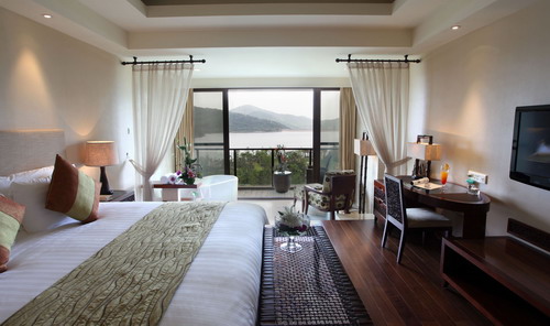 度假村坐落于九龍湖水系里的鳳凰湖畔,雖然沒有千島湖開元度假村的無敵水景,也比不上海南三亞度假酒店的全海景,然而度假村利用山水營造了清幽的環境。而且,此地可直通“長壽村”橫溪村,橫溪村空氣中負氧離子含量達到了2000-20000個,是名副其實的高含氧地區。憑借地利,酒店不僅擁有高含氧環境,日常用水也全部為山里湖水,“山水養生”這個度假概念在這里并不只是傳說。