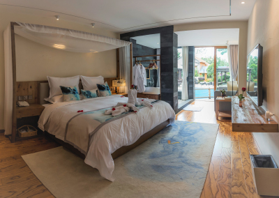酒店有9種房型,共40間/套客房,從山景、日式、庭院泡池、復式閣樓、融居小套到銀箔泉別墅,室內面積從28平方米至140平方米不等,大多配有浴缸。寬敞的客房,窗明幾凈,采用原木元素,置身其中,仿佛回歸原始森林一般自由。客房非常講究細節,從沙發、座椅、床墊再到衛浴,都帶給旅途勞頓的旅者最舒適的體驗。客房的各種小物件,香熏,精致茶器,件件招人喜歡。每間房都景色獨特,從床上望出去,蒼山的藍天云影盡入眼中,滿目是看不厭的云海山影。