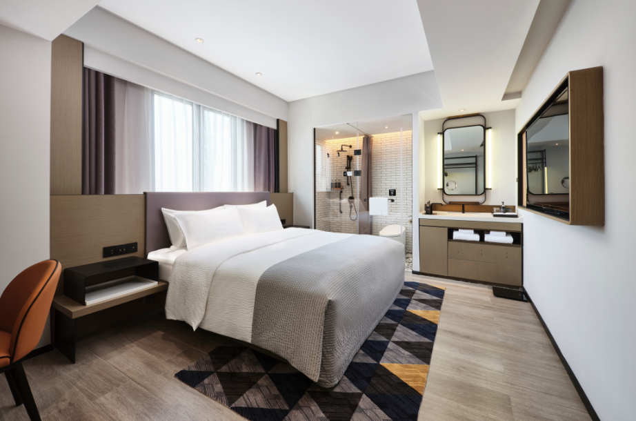 酒店客房設(shè)計了四種房型,分別為高級房、豪華房、高級豪華房和套房,面積在27-42平米,房型方正,舒適寬敞?头坎捎脮r下流行的摩登時尚設(shè)計風(fēng),為賓客打造了別具一格的休憩空間。