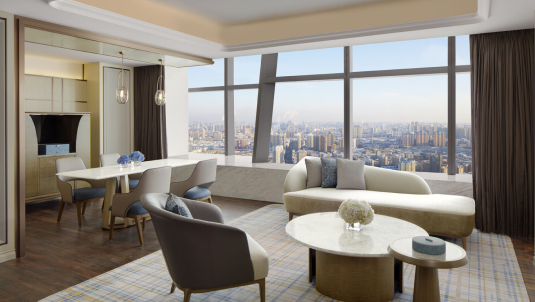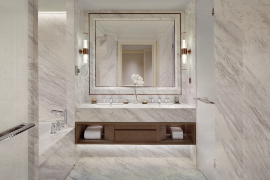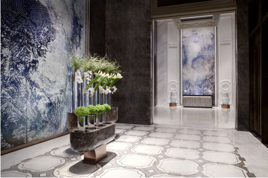 麗思卡爾頓套房中,Fromental手工制作的墻紙融合了多種設計元素和材料,包括絲綢、刺繡和手工繪畫,描繪出以俄羅斯與中國傳統瓷器為靈感而創作的精美紋飾,仿佛成為一件獨特的藝術品。麗思卡爾頓套房和行政套房中,客廳與浴室中使用的多種大理石材也完美契合了酒店的主題設計元素。