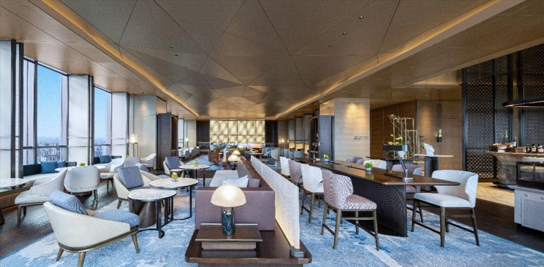 客人從大堂乘電梯,可直達35層明亮、潔凈、舒適的空中大堂。空中大堂的設(shè)計從長沙的傳統(tǒng)城市建筑中汲取靈感;將長沙古村落樸素的色彩轉(zhuǎn)變?yōu)槭婢彙⒅行缘纳{(diào),而門窗錯落有致的傳統(tǒng)房屋則通過簡潔的建筑線條,描繪出一種靜謐的設(shè)計語言。