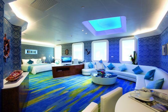 客房均為人造大理石整體建造,墻壁、客床都呈現流水形態,燈光營造出海洋與太空的唯美效果。