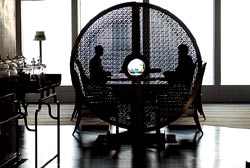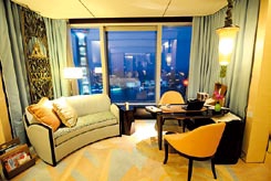 若在深夜,來到讓酒店總經理博瑞恩最自豪的58層頂層戶外酒吧,你會發出驚嘆,平常所見的東方明珠,像一個超大的發光球體玩具,在一旁陪襯著這間叫“FLAIR”的上海最高的酒吧。上周四晚深夜時分, 80個戶外位置座無虛席。每桌都放著一只做工精巧的來自意大利的蛋燈,表示已有人訂座,蛋燈發出鵝黃色的柔柔光芒,含蓄而醒目,融合在浦東建筑的輝煌燈火背景里,成為了上海不眠之夜的又一元素。