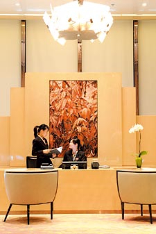 這是家有個性的酒店。一進電梯,粉紅色內飾讓人驚艷,那是手工縫制的珍珠魚皮,質感發亮的皮面和中間一粒粒小珠子組成的天然圖案,顯得古樸又奢華。行政酒廊不簡單,每天提供五次免費餐飲茶點,常見龍蝦、鵝肝、金槍魚,菜式做到每天一換,食物之精,五星酒店里不多見。酒店所屬的4間餐廳、酒吧,員工名片設計有意差異化處理,1層的“醇味”(aroma),名片采用巧克力色基調;“FLAIR”酒吧,采用不尋常的正方形;53層的“金軒”中餐廳,名片色調為淺紅到紅的漸變,背面那個“軒”字的兩豎一伸到底,突出氣勢。最讓人意外的是,與全球其他72家麗思卡爾頓不一樣,這家酒店的LOGO也做了小小的變動,八角形的鉆石花紋簇擁著那只威嚴的獅子。