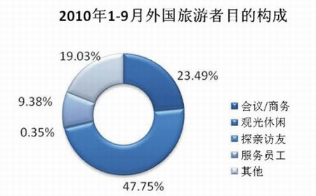 3.1 入境外國旅游者目的構(gòu)成 1-9月,我國累計接待的外國旅游者中,以觀光休閑為目的的旅游者人數(shù)最多,達(dá)929.17萬人次,占累計接待外國旅游者總?cè)藬?shù)的47.75%;以會議/商務(wù)為目的的達(dá)457.13萬人次,占23.49%;以探親訪友、服務(wù)員工和其他為目的的為6.67、182.54、370.29萬人次,分別占0.35%、9.38%和19.03%。