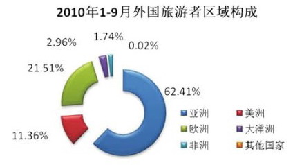 3.2 入境外國旅游者區(qū)域構(gòu)成 1-9月,我國累計接待的外國旅游者中,亞洲旅游者人數(shù)最多,達(dá)1214.39萬人次,占累計接待外國旅游者總?cè)藬?shù)的62.41%;歐洲旅游者人數(shù)次之,達(dá)418.60萬人次,占21.51%;美洲旅游人數(shù)位列第三,累計接待221.06萬人次,占11.36%;大洋洲和非洲累計接待旅游者人數(shù)為57.62萬人次和33.88萬人次,分別占2.96%和1.74%。
