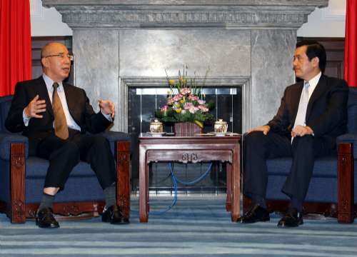 圖:馬英九(右)24日接見吳伯雄,表示國共論壇所討論的問題,最后必須要經;鶗、海協會形成法律文件