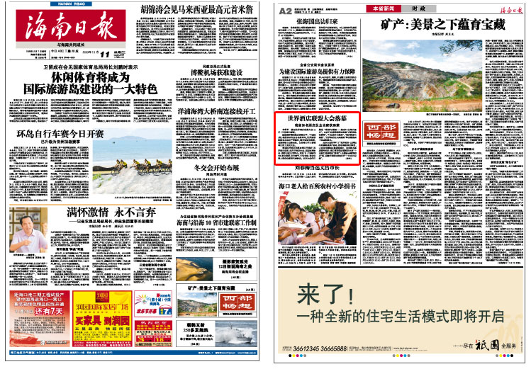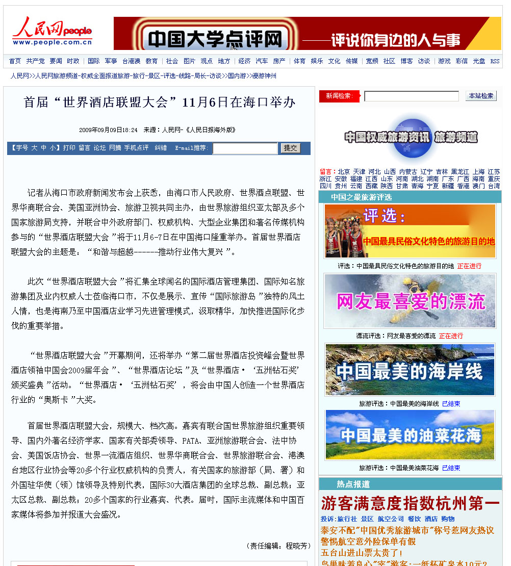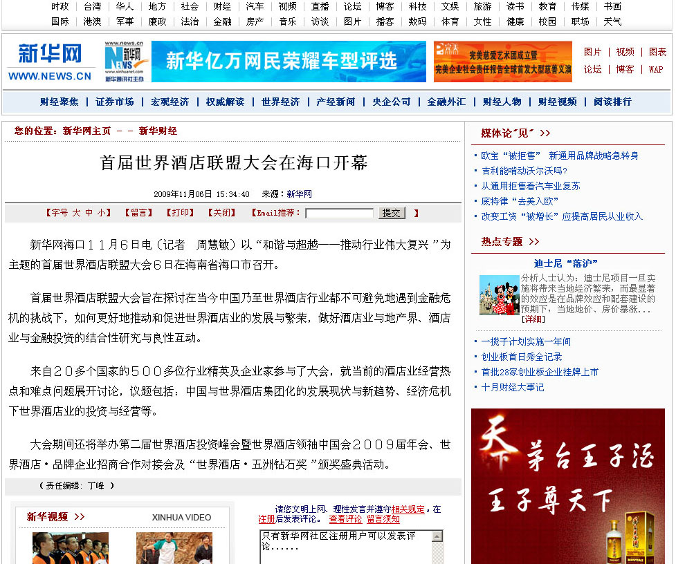 11月7日,由海口市人民政府、世界酒店聯盟、世界華商聯合會、美國亞洲協會、旅游衛視共同主辦,由世界旅游組織亞太部及多個國家的國家旅游局支持,并聯合中外政府部門、權威機構、大型企業集團和著名傳媒機構積極參與的“首屆世界酒店聯盟大會·第二屆世界酒店投資峰會暨世界酒店領袖中國會2009年會”在中國海口圓滿落下帷幕。二十多個國家的500多位行業精英和企業家與50多家主流媒體負責人和代表共同見證此項行業盛會。電視報紙網絡等媒體廣泛報道了此次盛會,以下是部分媒體報道鏈接: