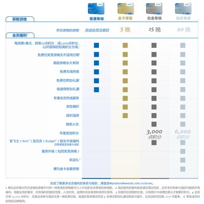 - 普通會員:會員注冊后即可自動獲取該等級!除本計劃的現有承諾(即針對所有符合資格的住宿,每消費1美元獲取10點積分或直接獲取1,000點積分,以及免費住 獎賞房晚無不適用日期)外,會員還能獲取免費無線網絡以及針對升級至下一會員等級的順延房晚。(順延房晚永不過期,并可幫助那些在某一年內未達到某等級的會員,于次年能繼續累積該等級所需要的符合資格的房晚數)。已經兌換了溫德姆酒店旗下其中一家頂級目的地酒店了?那就趕緊來體驗當地活動的樂趣吧,活動內容包括主題公園、城市觀光、烹飪課程等,還有每一獎賞房晚獲取5美元等值的附加禮遇獎賞,不容錯過。