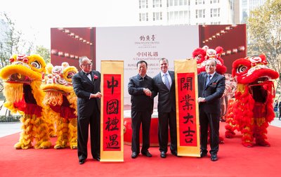 杭州泛海釣魚臺酒店開幕典禮,從左至右分別為:杭州泛海釣魚臺酒店總經理陳國基先生,泛海不動產投資管理有限公司董事長盧志壯先生,美高梅國際度假集團董事長、首席執行官釣魚臺美高梅酒店集團副董事長 吉姆·穆仁先生James J. Murren;杭州泛海釣魚臺酒店業主代表,副總經理王安輝先生