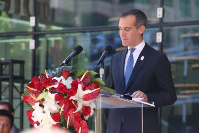 市長Garcetti 在致辭中表示,“今天開幕的綠地英迪格酒店是洛杉磯經濟復興的重要標志。感謝綠地集團的遠見與領導力,為洛杉磯建設了城市發展所急需的酒店。酒店的設計反映了洛杉磯的城市歷史與文化,作為市區的門戶,為人們帶來洛杉磯美好的第一印象。洛杉磯市與綠地美國緊密而牢固的合作伙伴關系是令人矚目的。英迪格酒店的350間客房增強了洛杉磯舉辦大型會展活動的接待能力。我們期待和綠地有更多的合作機會!”
