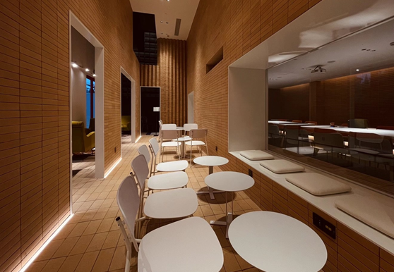 建筑上的特色直接反應這一理念,在6米挑空空間內,砌筑出一個盒子----營造出庇護所的安全感。空間主材為老上海最具有代表性建筑石庫門的材料---定制磚,整個空間的色調溫暖、熱情,每一面墻的設計都是一處打卡點。在賦予這個咖啡空間藝術性的同時,如咖啡希望吸引更多藝術家前來此空間創作、交流,成為藝術家們最鐘愛的咖啡館。