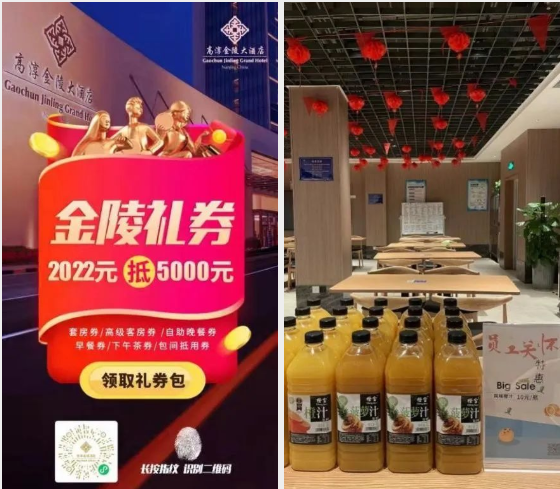 酒店于3月、4月分別上線餓了么和美團外賣平臺,提升人氣和口碑,增加收益。其次,如剛才提到的熱銷金陵禮券等產品為疫情復蘇后迎來客流打下了一定的基礎。再次,酒店還開展了“送餐入社區活動”,為社區帶來了便利,也為酒店實現了增收。