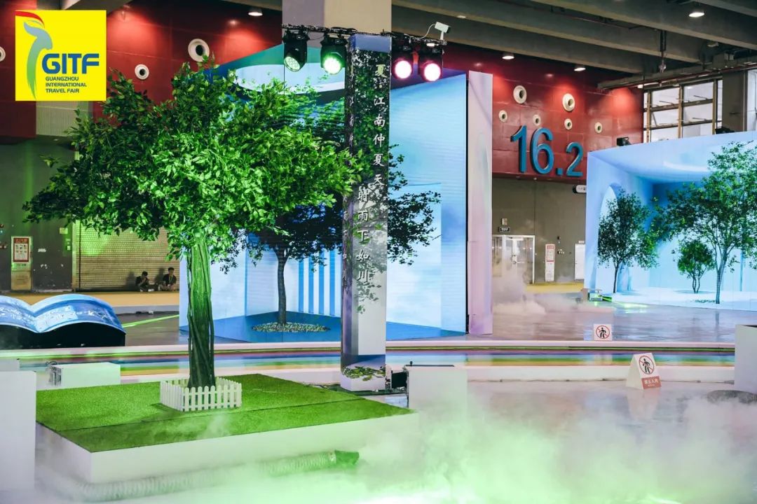 展會上,“文旅四季”成為了閃亮打卡點。從春天的蓓蕾到夏天的花開,再到秋天的落葉,最后到冬天的白雪皚皚,在廣州旅展現(xiàn)場,通過國內(nèi)首創(chuàng)柔性屏增添了視覺趣味體驗,并使用3D裸眼及國內(nèi)聲光電技術(shù),來呈現(xiàn)一年四季的變化可以欣賞自然界的變化。激光、專業(yè)水霧機共同營造了云端仙境效果,新型飛雪機現(xiàn)場造雪,配合畫面中的冬季場景,營造飄雪效果。四季的時間、空間和視覺概念在數(shù)字技術(shù)下煥然一新。
