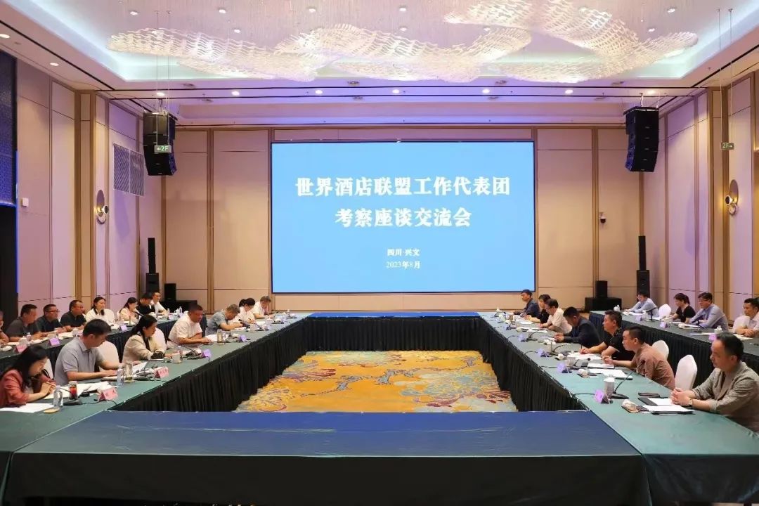 【泛旅通訊社8月28日興文電】8月27日,世界酒店聯盟工作代表團考察座談交流會在四川興文召開。縣委書記陳良云,縣人大常委會主任朱遠鵬,縣政協主席周麗虹出席會議。世界酒店聯盟主席、國際旅游與酒店聯合總會執行主席、中愛國際文旅集團董事會主席吳軍林,世界酒店聯盟副主席、深圳雅里數字科技集團董事長胡競選、世界酒店聯盟副理事長、寧波青藤酒店集團董事長等出席會議。