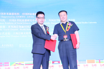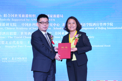 Gu Huimin, Dean of the School of Hospitality Management of Beijing International Studies University Presenting Part-time Professor Certificate to Wu Junlin, Founding Chairman of World Hotel Association