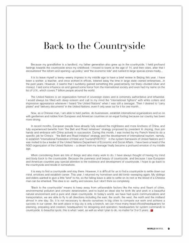 “Back to the countryside” means to keep away from unfavorable factors like the noisy and flaunt of cities, environmental pollution and climatic deterioration, and to build an ideal site for both life and work in a beautiful natural environment and a pure and clean countryside. In today’s world, we have had quick communications and transportation, we are able to fly to all directions including the east, the south, the west, the north and the midland almost in one day. So, it is not necessary to devote ourselves in big cities to compete our work and achieve a success in our career, the work place in big city is only a branch, we can move many head offices(headquarters for planning, preparing and creation; headquarters for designing and operation; headquarters for system command) to countryside, to beautiful spots, this is what I want, as well as what I plan to do, no matter for 3 or 5 years...