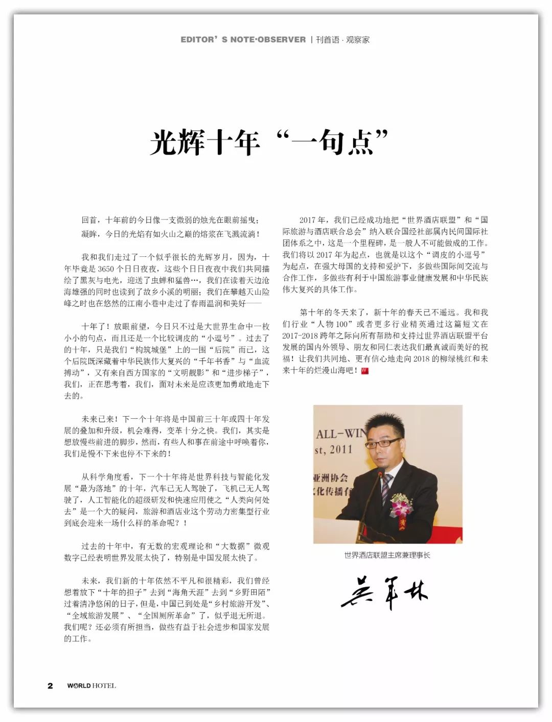 2017年,我們已經成功地把“世界酒店聯盟”和“國際旅游與酒店聯合總會”納入聯合國經社部屬內民間國際社團體系之中,這是一個里程碑,是一般人不可能做成的工作。我們將以2017年為起點,也就是以這個“調皮的小逗號”為起點,在強大母國的支持和愛護下,多做些國際間交流與合作工作,多做些有利于中國旅游事業健康發展和中華民族偉大復興的具體工作。