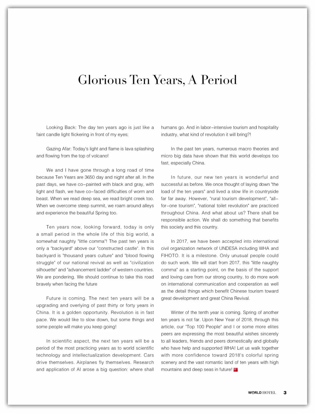 Winter of the tenth year is coming. Spring of another ten years is not far. Upon New Year of 2018, through this article, our "Top 100 People" and I or some more elites peers are expressing the most beautiful wishes sincerely to all leaders, friends and peers domestically and globally who have help and supported WHA! Let us walk together with more confidence toward 2018's colorful spring scenery and the vast romantic land of ten years with high mountains and deep seas in future!