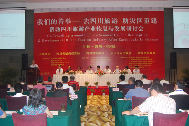 為響應黨中央、國務院關于幫助和支持四川地震災區恢復重建的號召,表達中國旅游業對四川地震災區人民的關心與支持,由四川省旅游局、四川省招商引資局、樂山市人民政府和世界酒店聯盟共同發起并主辦的“我們的善舉——‘去四川旅游·助災區重建’系列活動”2008年7月12日在四川省峨眉天頤溫泉度假大飯店正式拉開了帷幕,系列活動的開場活動——“幫助四川旅游產業恢復與發展”研討會也同日召開。來自國家旅游局等主管部門領導、協會負責人、大型投資企業集團首腦、著名旅行社及酒店企業高管、世界酒店聯盟的創始成員,以及專家學者共100多人聚四川峨眉山,希望通過他們的呼吁讓國內外全面地、正確地了解地震災害對四川地區旅游經濟造成的巨大損失,協助當地旅游及酒店產業順利恢復與振興。