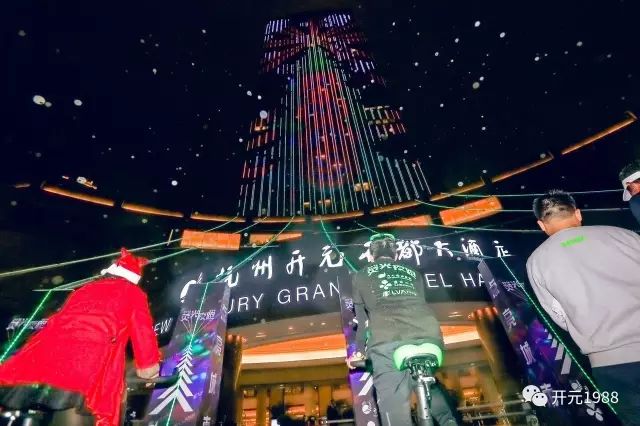你見過的最大的圣誕樹有多大?3米?5米?12米?可是你見過218米高的圣誕樹嗎?陳妙林董事長、與迪生光電的李建成董事長以及各大高校的青年學子一起騎上八輛磁控動感單車,隨著車輪的轉動,八道閃亮的光線迅速延伸到杭州開元名都的大樓,最后一棵218米高的圣誕樹點亮了這座城市的夜空。這棟曾經在情人節感動了上億人的最有愛的大樓,再一次用光亮溫暖了整座城市的夜空!