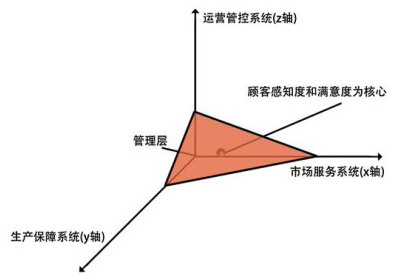 2.圍繞顧客感知度和滿意度核心,以管理層為三維核心統一體系的坐標軸原點,在其宏觀管控之下,當項目要求生產保障系統作為項目主要負責方,市場服務系統和運營管控系統作為輔助方時,三維核心統一體系呈以下圖示: