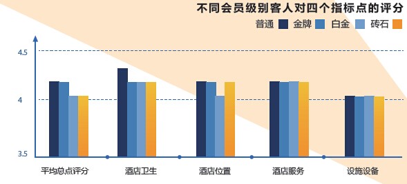 無論哪個級別的用戶,在“酒店位置”、“房間衛生”、“酒店服務”、“設備設施”這四大指標中,“設備設施”始終是聚焦所在。或因更多“上了年紀”的酒店開始重視硬件設施的建設,都開始了新一輪的翻新,而新開業的酒店則有針對性地加強了硬件投入。“設備設施”評分雖然依舊不高,但這個常年弱勢的“群體”也算是有了一定的進步。