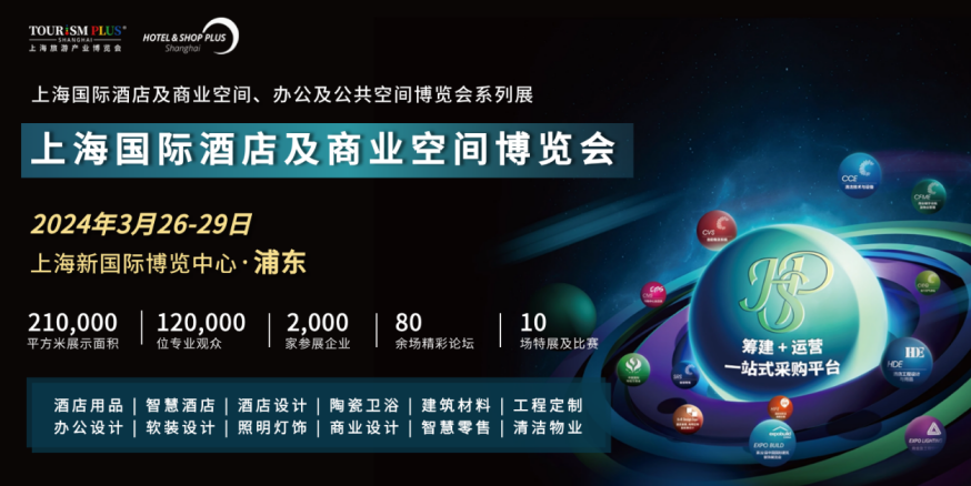 2024Hotel &Shop Plus上海國際酒店及商業空間博覽會展示面積將達210,000平方米展示面積,匯聚2000余家展商,展品涵蓋衛浴及整體解決方案、陶瓷、地面材料、整裝定制及工程設計、墻體材料及精品設計、智慧酒店、照明及智能控制、酒店用品、酒店布草及制服、商業空間、辦公及公共空間等各類新展品、新技術,為120,000+專業觀眾提供高效的采購選材與業務交流平臺,持續打造高質量、高水平的酒店及商業空間建設與運營采購盛會。