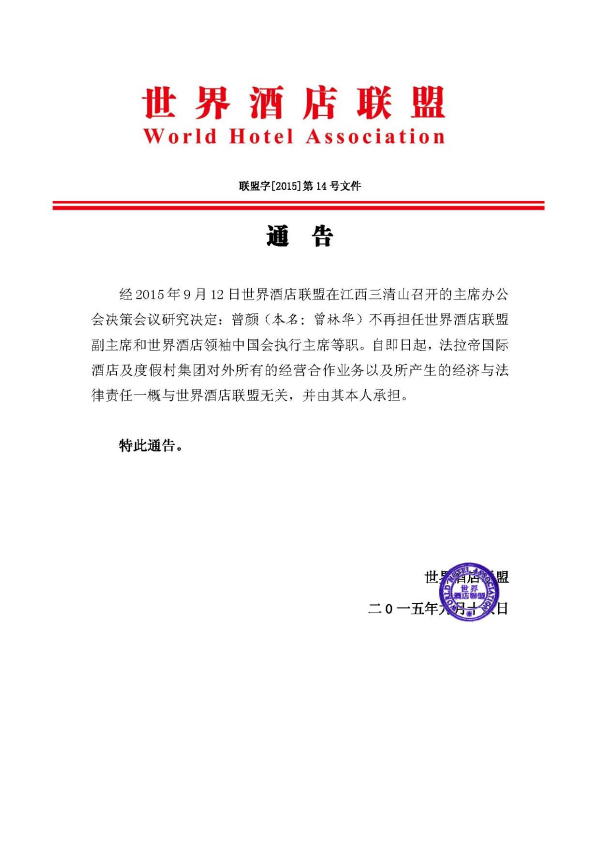 特別通告:世界酒店聯盟有限公司北京代表處正式批準設立