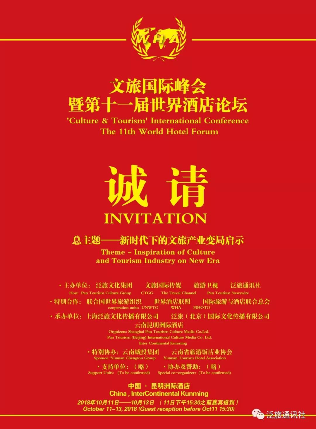 尊敬的各位業界領導、同仁、名流及媒體朋友們,您們好!首先感謝您們長期以來對我們的大力支持和關愛!未來在中國將會出現更多的國際性論壇(會議、展覽)平臺,這是一個必然的大趨勢。今年,我們將在“七彩云南”省會昆明舉辦“文旅國際峰會暨第十一屆世界酒店論壇”,我們誠摯邀請您出席本屆論壇峰會,因為有聚合和面對面交流才會有更多的牽手和多贏機會。讓我們今年十月相會在中國春城昆明; 讓我們在行業中的思想智慧和經驗成果在全球范圍內得以良好傳播和分享。平臺無論是在中國還是在歐美,無論是在都市還是在邊城,其傳播和收獲的效果都是一樣的,最主要的是會議要重視創新品質和高度價值!我們在這里,真誠歡迎您,并希望您給自己一個絕佳出場機會!