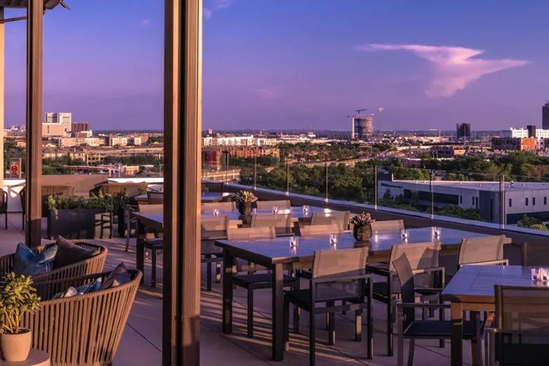 The hotel includes two food-and-beverage options. The Canopy Central Café, housed in the lobby, is a European-style café serving an artisanal-style breakfast that transitions into an all-day lunch and dinner menu, offering dishes such as flatbreads and open-faced sandwiches. The second is the Upside West Village, a rooftop bar and lounge offering views of downtown Dallas. Upside’s mixology program, curated by Proprietors, the team behind famed Death & Co bars, includes craft cocktails, local and craft brews and a wine list by the glass or bottle. The locally-sourced food menu includes small bites and shared plates, varying from Citrus Salmon Tartare to Spicy Chicken Bravas. Open from 4 p.m. to midnight daily, Upside West Village has a separate elevator entrance from the hotel.