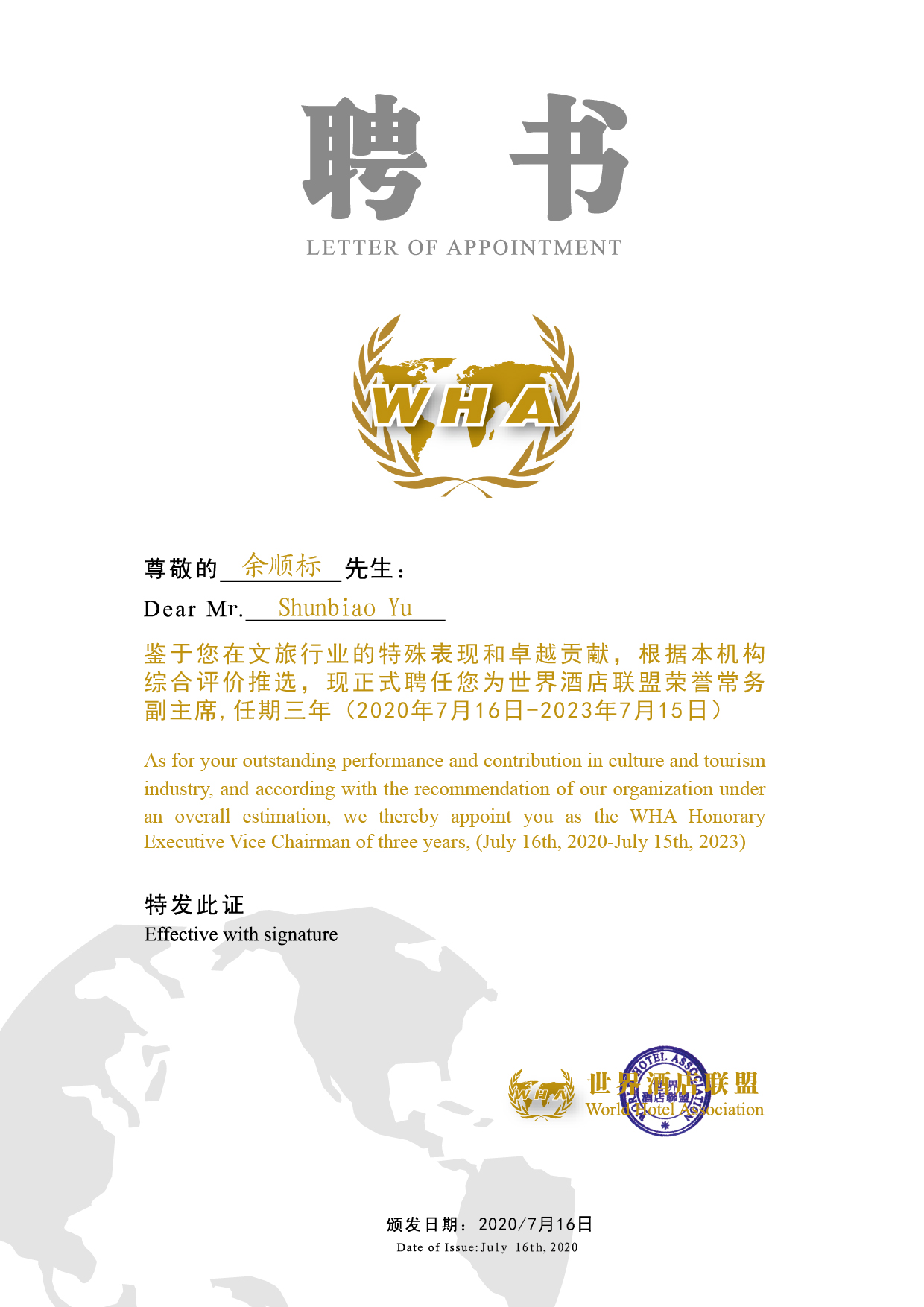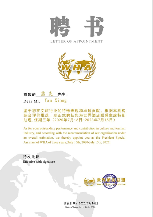 After the study decided, we will continue to hire Yu Shunbi (The Executive Vice President of the Panama World Expo and Chairman of the China District, Executive Chairman of the World Association of Chinese Entrepreneurs) as Vice President of the World Hotel Association and Xiong Yan (General Manager of Huaxi Region of China Financial Leasing Co., Ltd.) as Special Assistant to the President of the World Hotel Association. Term of three-year term (two letters of appointment in both Chinese and English).