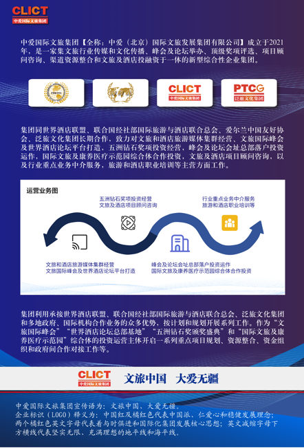 該集團同世界酒店聯盟、聯合國經社部國際旅游與酒店聯合總會、愛爾蘭中國友好協會、泛旅文化集團長期合作,致力對文旅和酒店旅游媒體集群經營、文旅國際峰會及世界酒店論壇平臺打造,五洲鉆石獎項投資經營,峰會及論壇會址總部落戶投資運作,國際文旅及康養醫療示范園綜合體合作投資,文旅及酒店項目顧問咨詢,以及行業重點業務中介服務,旅游和酒店職業培訓等主營方面工作。集團利用承接世界酒店聯盟、聯合國經社部國際旅游與酒店聯合總會、泛旅文化集團和多地政府、國際機構合作業務的眾多優勢,按計劃和規劃開展系列工作。作為“文旅國際峰會”“世界酒店論壇總部基地”“五洲鉆石獎頒獎盛典”和“國際文旅及康養醫療示范園”綜合體的投資運營主體開啟一系列重點項目規劃、資源整合、資金組織和政府間合作對接工作等,集團在北京、上海、巴黎設有工作機構,并在“海南自貿港”設立辦公室和運營中心。中愛國際文旅集團董事會主席由著名文旅專家、世界酒店聯盟主席、聯合國經社部國際旅游與酒店聯合總會執行主席、泛旅文化集團董事長吳軍林擔任。