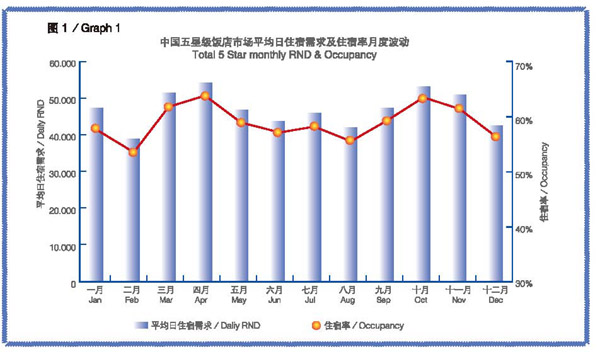 圖1顯示了參與本次調查的所有五星級飯店(一些開業不足整年的飯店剔除在外)平均日住宿需求及住宿率月度趨勢。此圖清晰地表明,從5月份至9月份期間,全國范圍內的飯店表現出了市場住宿需求受到抑制和減弱。